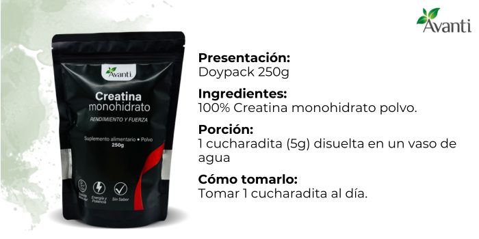 La creatina ayuda a reponer el ATP, la molécula de la energía.Si producimos suficiento ATP nuestro cuerpo se siente con mayor fuerza y potencia en ejercicios de alta intensidad, ayudando a mejorar la recuperación.